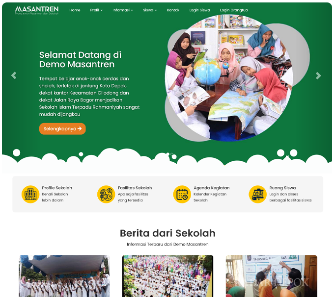 Masantren adalah sebuah flatform Sistem Informasi Akademik Berbasis awan (Cloud) untuk Sekolah yang terintegrasi dengan website sebagai penyampai informasi kepada stakeholder sekolah itu sendiri. Aplikasi Sistem Informasi Akademik Masantren dapat diakses menggunakan browser favorit anda.